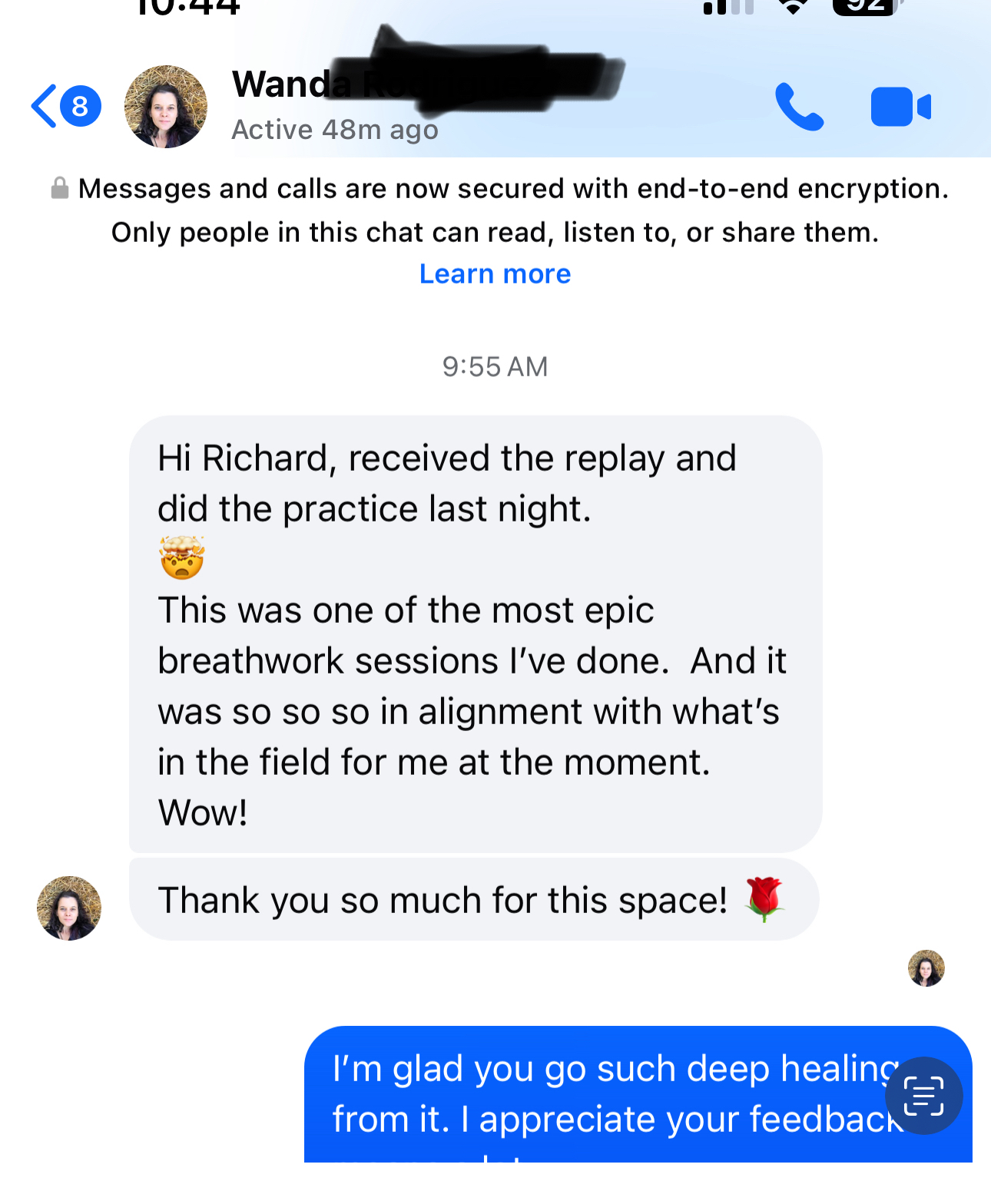 ” Hey Richard, Wanted to say a massive thank you for the 7 week journey! What a way to wrap up this cycle 🙏 It was a last minute decision on my part and I honestly didn’t know what to expect. Like wow - talk about a ride!!!! For me it started off super gentle and then by week two - bam - I was witnessing and releasing so much!!!!! I was able to touch into parts of myself that I haven’t quite been able to access. Each week was a beautiful continuation from the last, and the amount of synchronicities, aha moments, reflections and integrations from week to week flowed rather exquisitely. You hold such impeccable space and I always feel very held and safe in your spaces. Thank you for witnessing us and for curating this experience. It truly was a wonderful offering! ✨✨✨
